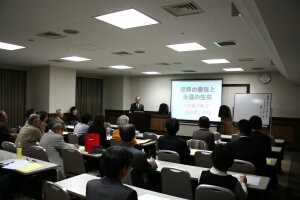 講 師:田中 雅道(国際愛善宣教課主幹) 講座要旨: 「第157回大本公開講座は、3月16日午後7時から、港区新橋の航空会館で開催され、田中雅道国際愛善宣教課主幹が「世界平和の実現に向けて~大本と平和~」と題して講演した。参加者は29人(内、一般9人)。 講座では、大本がこれまで推し進めてきた、世界における平和活動を紹介しながら、「歴代の教主・教主補は常に世界平和を祈られてきた。宗教は本来、神さまのみ心に従って、平和を築くべきものである」と述べ、「世界の宗教が交流することで、お互いを認め合うことができ、力を合わせることで、世界平和へ向かう」と結んだ。 参加者からは、「世界中で宗教同士の争いが激しくなる中、本来の宗教のあり方を学ばさせていただきました(男性・一般)」等の声が寄せられた。 |