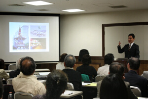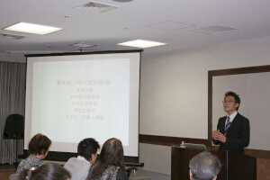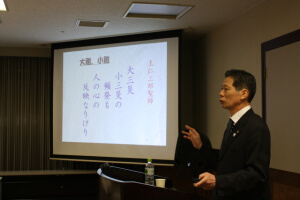 | 講 師:椎野 恭三(東京宣教センター祭務課主幹) 講座要旨: 第181回「21世紀・生きがい講座」は、3月21日午後7時から、港区新橋の航空会館で開催され、椎野恭三祭務課主幹が「王仁三郎と大本歌祭~平和を祈る敷島の道~」と題して講話した。参加者は28人。 椎野講師は、八雲神歌の神話としての背景と、王仁三郎聖師の言霊学からの解釈を説明。「古来から続く敷島の道、また民衆の中に息づいてきた〝歌垣〟は、和歌に潜む言霊の功徳が信じられてきた証である」と述べた上で、教主さまの「歌祭のよきひな型が、今後、国境も人種も宗教も超え、平和と和合の祭典として世界大に開かれていくことは間違いないようです」とのご教示を紹介し、王仁三郎聖師が復興した〝大本歌祭〟の今日的意義を語った。 参加者からは「大本歌祭の未来につながる大きな意義が理解できた」(男性・信徒)、「大本と中東和平プロジェクトにかかわる話が大変印象に残った」(女性)などの声が寄せられた。 |