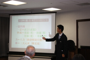 講 師:小藪 資史(特派宣伝使) 講座要旨: 第175回「21世紀・生きがい講座」は、9月20日午後7時から、港区新橋の航空会館で開催され、小藪資史・特派宣伝使が「ポテンシャルの引き出し方 ~自己魂を練る~」と題して講話した。参加者は22人(内、一般1人)。 講師は、ポテンシャルとは潜在的な能力と説明、「私たちは一霊四魂という魂を頂いている」と述べ、直霊と荒魂、奇魂、幸魂、和魂の働きをそれぞれ紹介。「祈りを中心として、四魂を磨いてゆくことが、自己の魂の潜在能力、ポテンシャルを高めることになる」と語った。 |