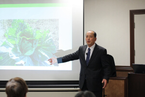 講 師:小林 善直(専業農家) 講座要旨: 第176回「21世紀・生きがい講座」は、10月18日午後7時から、港区新橋の航空会館で開催され、一般社団法人愛善みずほ会会員で専業農家の小林善直講師が「正しい食、農のあり方の実践~農道まっしぐら~」と題して講話した。参加者は20人。 講師は、新鮮な野菜の見分け方や選び方を紹介。また農薬が有害であり、かつ大自然の食物連鎖を損なうことも指摘。「『人群万類愛善』の精神で全てを生かす農法が必要」として、有効微生物や酵素作用によって地力を高め、安全で栄養価の高い農産物を増産する自然農法・島本微生物農法も紹介した。 また、「大本の出口なお開祖さまは、百万円のお金より一片のお土のほうがどれだけ大切かが分かれば“みろくの世”になるとお諭しになっておられる」と述べ、一人ひとりがお土から出来たものを大切にし、お土を拝む心にならなければならないと話した。 |