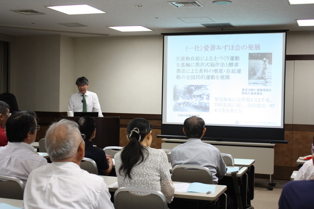 | 講 師:島本 光久(酵素の世界社 代表取締役専務) 講座要旨: 第186回「21世紀・生きがい講座」は、8月15日午後7時から、港区新橋の航空会館で開催され、酵素の世界社代表取締役専務・島本光久講師(愛善みずほ会会長)が、「農は国の大本~お土の心に学ぶ~」と題して講話した。参加者は25人。 島本講師は、大本が開教以来、土を「お土」として尊み、歴代教主さまが折に触れてその大切さを教示されていることを紹介。現教主さまも「お土を大切にする教団でありたい」と述べられてる、として、天産物自給自足の農法、土作り運動を、「愛善みずほ会」が昭和20年代初頭から担ってきた歴史と活動を紹介した。 参加者からは「有機肥料と化学肥料の違い、土作り、酵素農法、内容の深さにおどろきです」(男性)などの声が寄せられた。 |